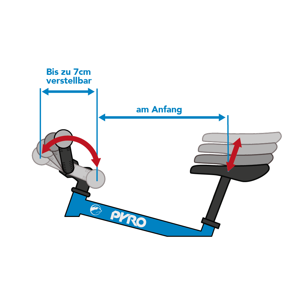 - Durch die Drehbar (englisch „bar“= Lenker) wächst das Rädle lange mit, da der Lenker am Anfang nahe zum Sattel montiert werden kann. Später ist es möglich die Drehbar bis zu 7 cm nach oben/vorne zu verstellen.
